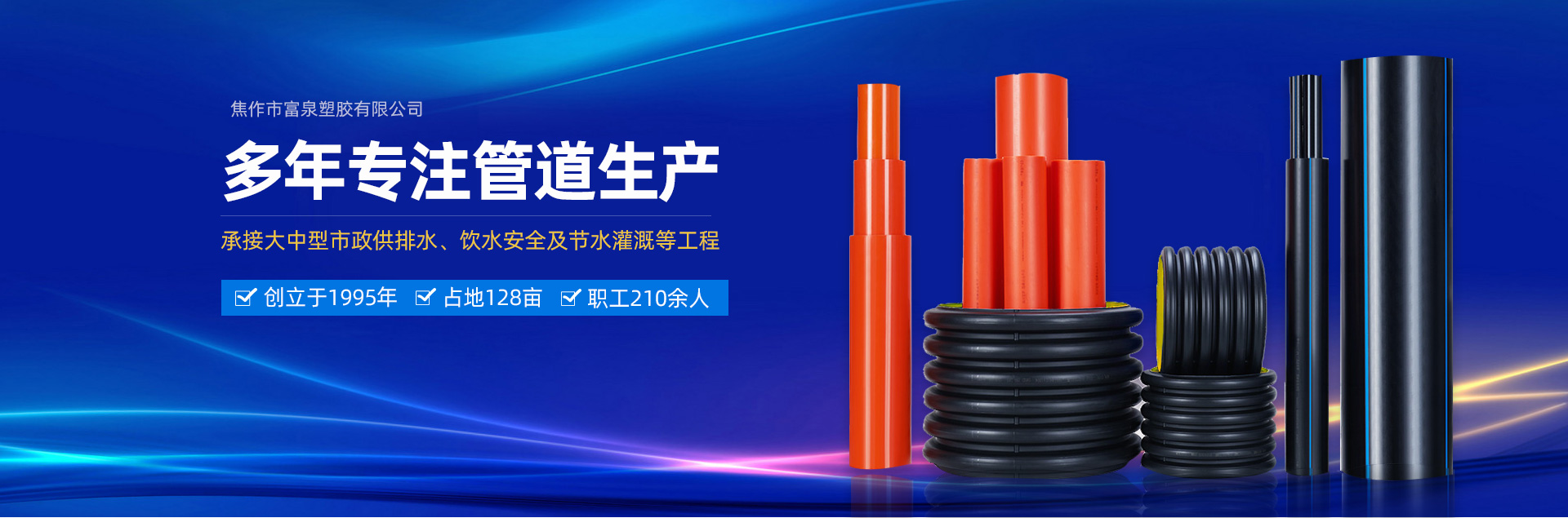 焦作市富泉塑膠有限公司,創立于1995年,是一家集研發、設計、生產、銷售為一體的大型管材企業。公司位于太極故里、黃河之濱一一河南焦作溫縣。公司占地128畝,現有職工210余人,其中具有中技術職稱的19人。生產、檢驗設備58臺(套),包括PVC實壁管生產線11套、PE實壁管生產線12套、HDPE雙壁波紋管生產線6套、PVC雙壁波紋管生產線5套,檢驗設備14臺(套)。主要產品有:Φ20mm-630mm、各種壓力規格的PVCU、PVC-M、PE給水管材,PVC-U節水灌溉管材,HDPE燃氣和礦用管材,DN200-800mm的HDPE、PVC雙壁波紋管及各種噴灌、滴灌工程材料。承接大中型市政供排水、飲水安全及節水灌溉等工程。  富泉塑膠公司重視產品的質量、安全、環保和節能,在同行業中率先完成了“新華節水產品認證”,全方面通過ISO9001:2008國際質量管理體系、IS014001:2004環境管理體系和OHSAS18001職業健康安全管理體系的一體化導入,并建立起規范的現代企業管理體系。公司以“質量”為先導,采用質量跟蹤、多環節把關的方法,組建具有行業水準的企業技術檢測中心,常年委托水利部節水灌溉設備檢測中心、河南省產品質量監督檢驗院對產品跟蹤檢測,并由中國人民保險公司承保產品質量。公司連續多年被河南省水利廳確定為“安全飲水設備、節水灌溉設備”定點生產企業,并獲得“中國名優產品”“質量、服務、信譽AAA企業”“河南省**產品”“河南省水利企業”“河南省守合同、重信用企業”等榮譽稱號。  富泉塑膠公司堅持“用戶為上”的服務理念,長期以來,全方面關注客戶價值,不斷提升服務水平。服務隊伍常年為客戶的產品設計、施工、安裝提供合理的方案和全程細致、周到、**、快捷的技術服務。公司自成立以來,一直堅持以人為本的宗旨,塑造企業形象,并致力于新產品的開發,憑借雄厚的技術開發能力,先進的工藝制造流程,嚴格的質量管理保證體系,優良的售后服務網絡,已成為河南省大的飲水、灌溉及排水管材設備制造商。產品暢銷全國,而且還以公司雄厚的綜合實力在業界中占據著重要的地位。